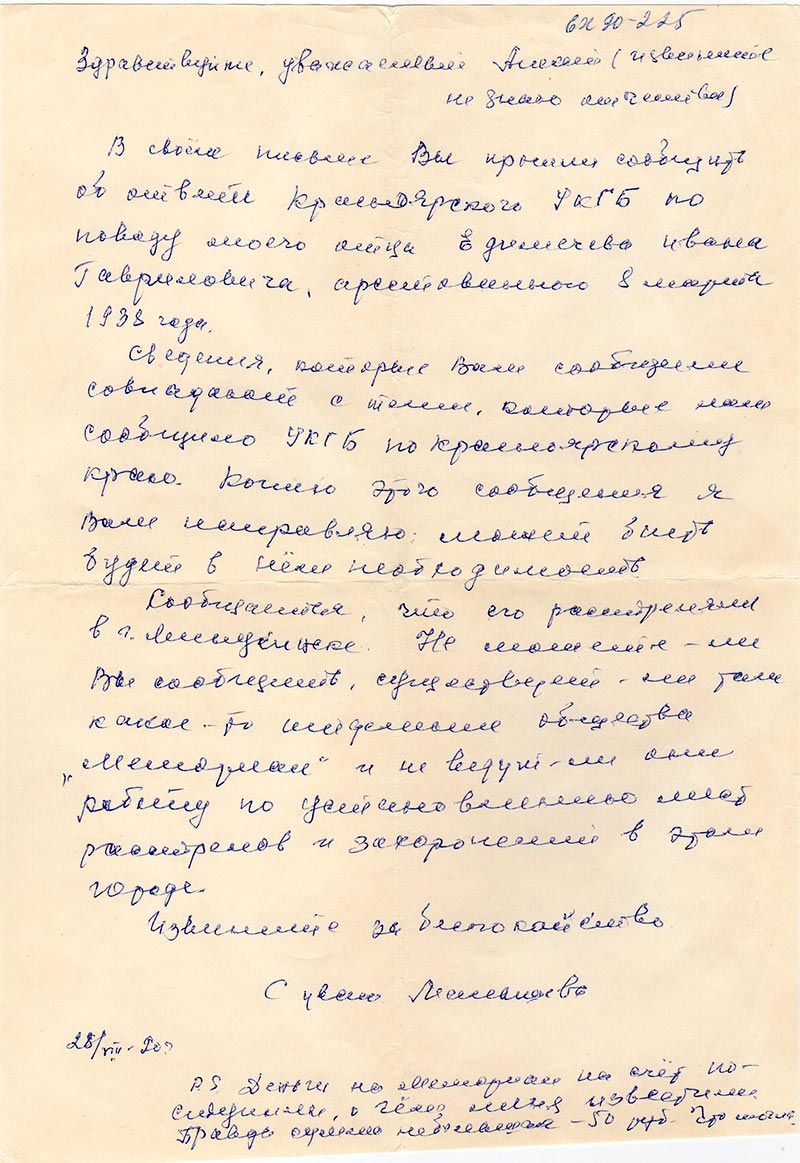 Сведения, которые Вам сообщили совпадают с теми, которые нам сообщило УКГБ по Красноярскому краю. Копию этого сообщения я Вам направляю: может быть будет в нём необходимость.