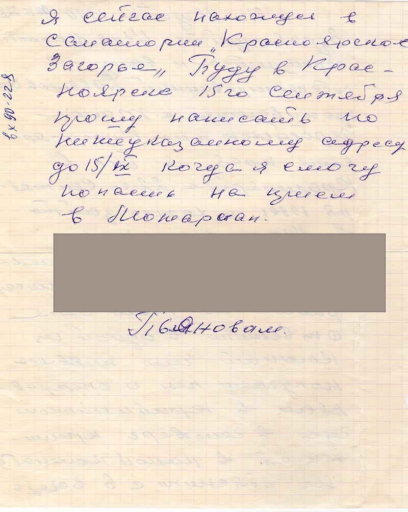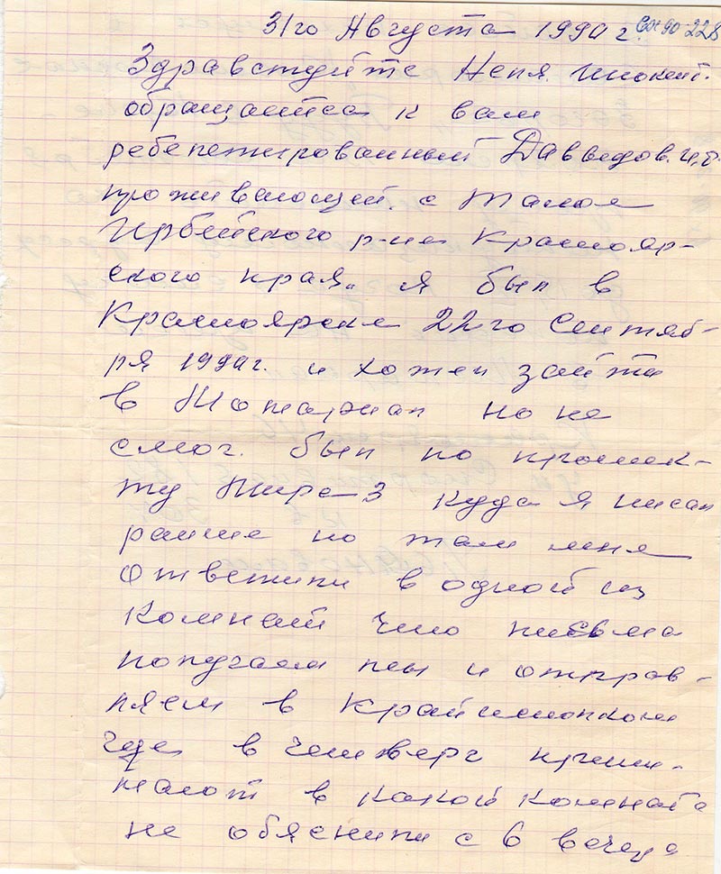 Здравствуйте Неля Инокент. обращается к вам ребелетированный Давыдов И.Т. проживающий с Талое Ирбейского р-на Красноярского края. Я был в Красноярске 22-го Сентября 1990 г. и хотел зайти в Момариал но не смог. был по проспекту Мира 3 куда я писал ранее но там мне ответили в одной из комнат что письма получаеш ты и отправляеш в крайисполком где в четверг принимают в какой комнате не объяснили с 6 вечера. Я сейчас нахожусь в санатории «Красноярское Загорье».