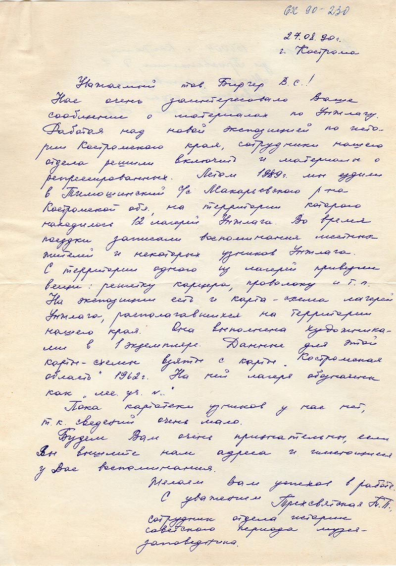 Нас очень заинтересовало Ваше сообщение о материалах по Унжлагу. Работая над новой экспозицией по истории Костромского края, сотрудники нашего отдела решили включить и материалы о репрессированных. Летом 1989 г. мы ездили в Тимошинский с/с Макарьевского р-на Костромской обл., на территории которого находилось 12 лагерей Унжлага. Во время поездки записали воспоминания местных жителей и некоторых узников Унжлага. С территории одного из лагерей привезли вещи: решетку карцера, проволоку и т.п. На экспозиции есть и карта-схема лагерей Унжлага, располагавшихся на территории нашего края. Она выполнена художниками в 1 экземпляре. Данные для этой карты-схемы взяты с карты «Костромская область» 1962 г. На ней лагеря обозначены как «лес. уч.№ …».