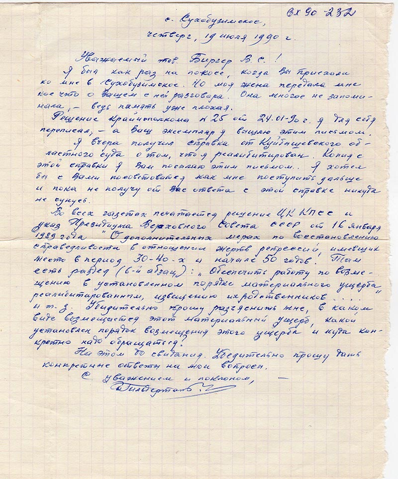 Я вчера получил справка от Куйбышевского областного суда о том, что я реалибитирован. Копия с этой справки я вам посылаю этим письмом. Я хотел бы с Вами посоветоватся как мне поступить дальше и пока не получу от Вас ответа с этой справке никуда не сунусь.