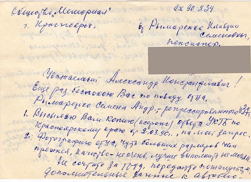 Ещё раз беспокою Вас по поводу отца, Рымаренко Семёна Андр.,- репрессированного в 37 г.
