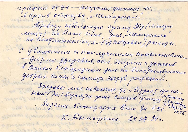 Переведу небольшую сумму 30 р. (малую лепту) на Ваше имя, для «Мемориал» на неотложные (хотя бы почтовые) расходы.