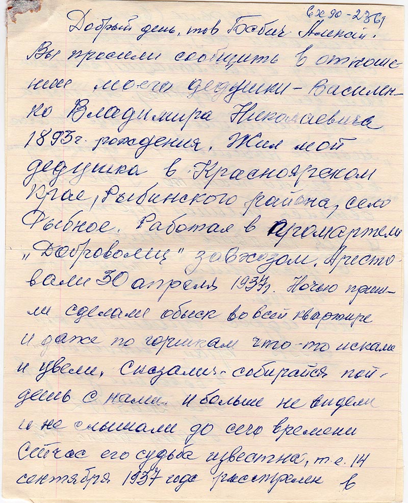 Вы просили сообщить в отношении моего дедушки – Василенко Владимира Николаевича 1893 г. рождения. Жил мой дедушка в Красноярском крае, Рыбинского района, село Рыбное. Работал в промартели «Доброволец» завхозом. Арестовали 30 апреля 1937 г. Ночью пришли сделали обыск во всей квартире и даже по горшкам что-то искали и увели. Сказали – собирайся пойдешь с нами. И больше не видели и не слышали до сего времени. Сейчас его судьба известна, т.е. 14 сентября 1937 года расстрелен в канской тюрьме (вернее за пределами её).