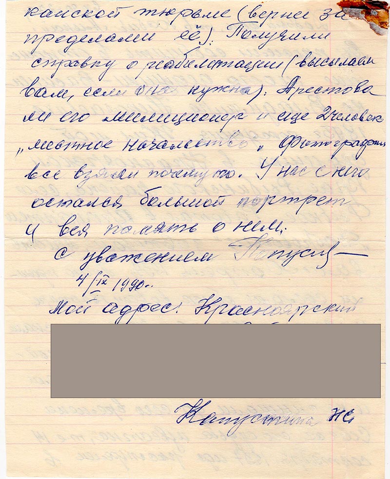 Получили справку о реабилитации (высылаем вам, если она нужна). Арестовали его милиционер и еще 2 человек «местное начальство». Фотографии все взяли почему то. У нас с него остался большой портрет и вся память о нем.