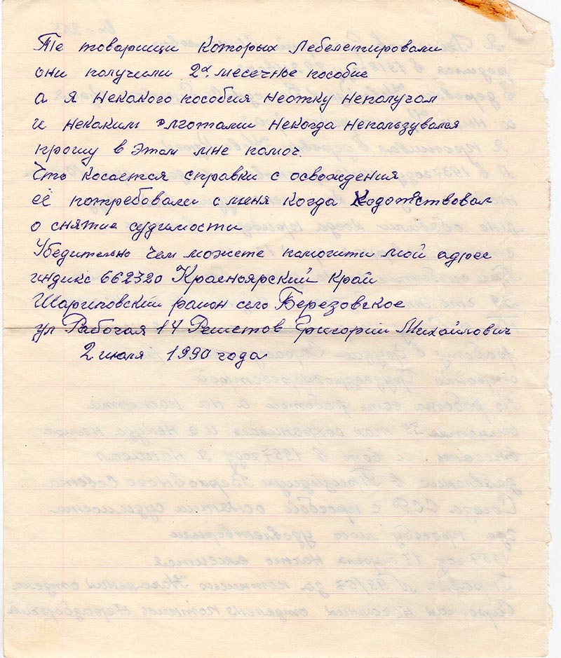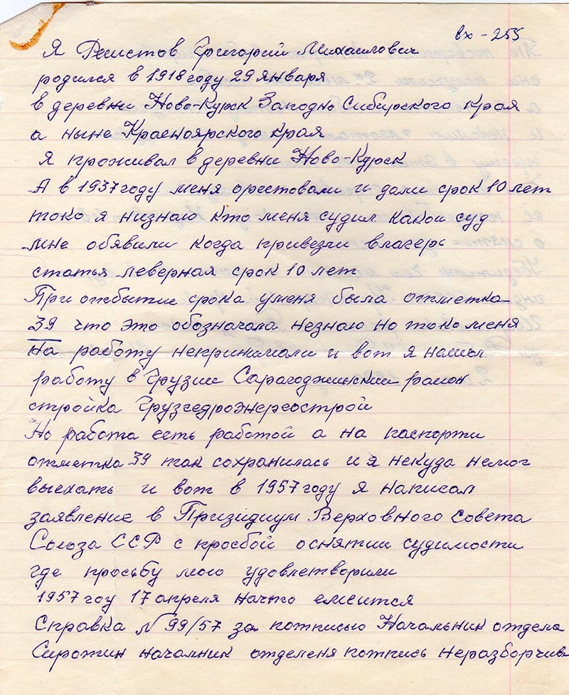 Но работа есть работой а на паспорти отметка 39 так сохранилась и я некуда не мог выехать и вот в 1957 году я написал заявление в Призидиум Верховного Совета Союза ССР с просьбой о снятии судимости где просьбу мою удовлетворили в 1957 гоу 17 апреля начто емеится Справка № 99/57 за потписью Начальник отдела Сиротин начальник отделеня потпись неразборчиво