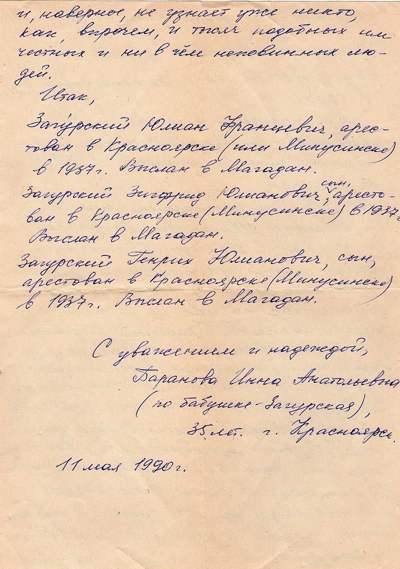 Загурский Генрих Юлианович, сын, арестован в Красноярске (Минусинске) в 1937г.