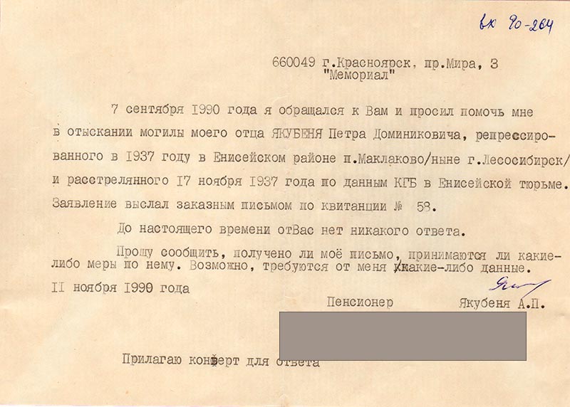 7 сентября 1990 года я обращался к Вам и просил помочь мне в отыскании могилы моего отца ЯКУБЕНЯ Петра Доминиковича, репрессированного в 1937 году в Енисейском районе п. Маклаково /ныне г. Лесосибирск/ и расстрелянного 17 ноября 1937 года по данным КГБ в Енисейской тюрьме. Заявление выслал заказным письмом по квитанции № 58.