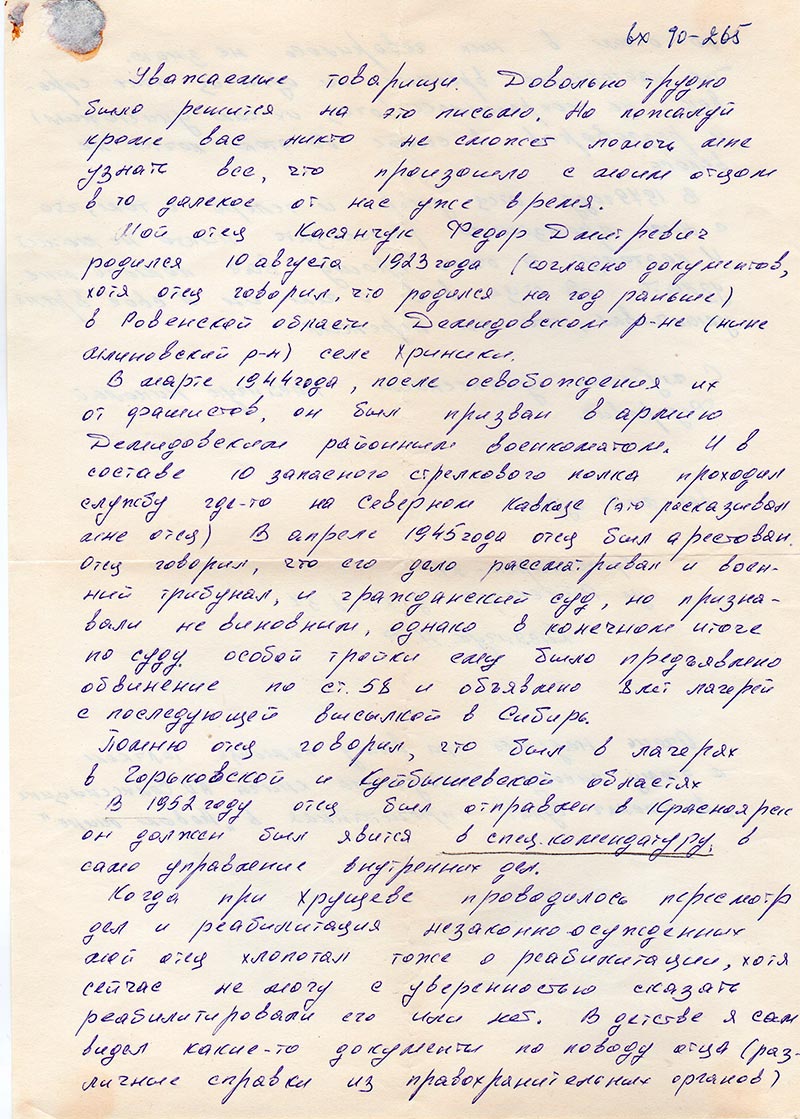 Уважаемые товарищи. Довольно трудно было решится на это письмо. Но пожалуй кроме вас никто не сможет помочь мне узнать все, что произошло с моим отцом в то далекое от нас уже время.