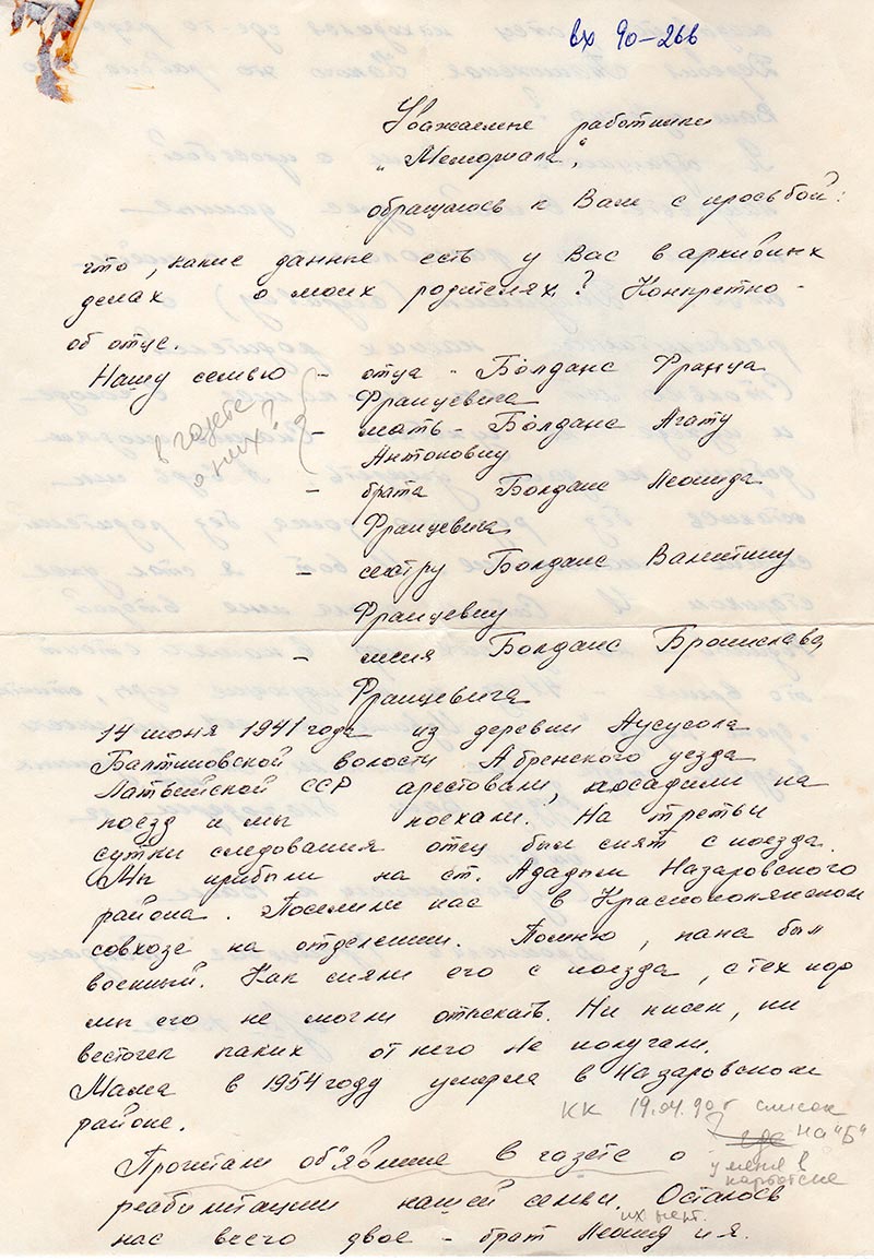 Я обращаюсь к Вам с просьбой. Направьте в мой адрес данные какими Вы располагаете о моем отце. Документ (справку) о реабилитации наших родителей. Столько лет мы мыкались в голоде и нужде на чужбине. Спасибо людям добрым не дали умереть. А ведь мы остались без родного дома, без родителей совсем маленькие. И вот я стал уже стариком. И Сибирь стала мне второй Родиной – но до сих пор в памяти стоит то время – 41 год и последующие годы, отметки, «враги народа» и т.д. Извините, если есть неточности в адресе, откуда нас выслали. Точных данных нет.