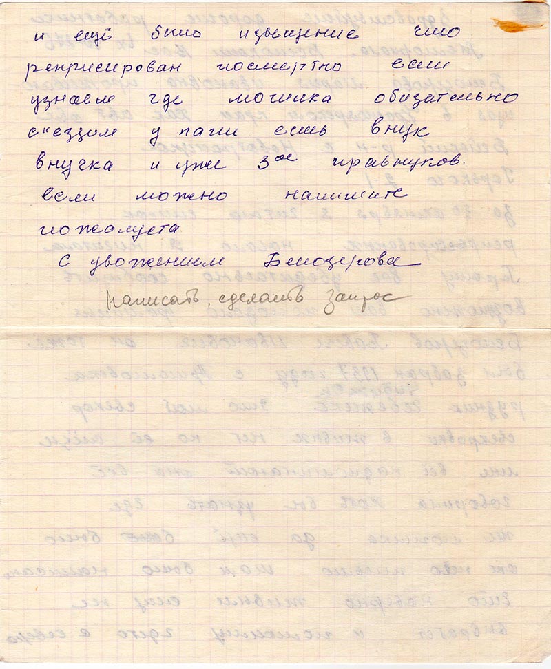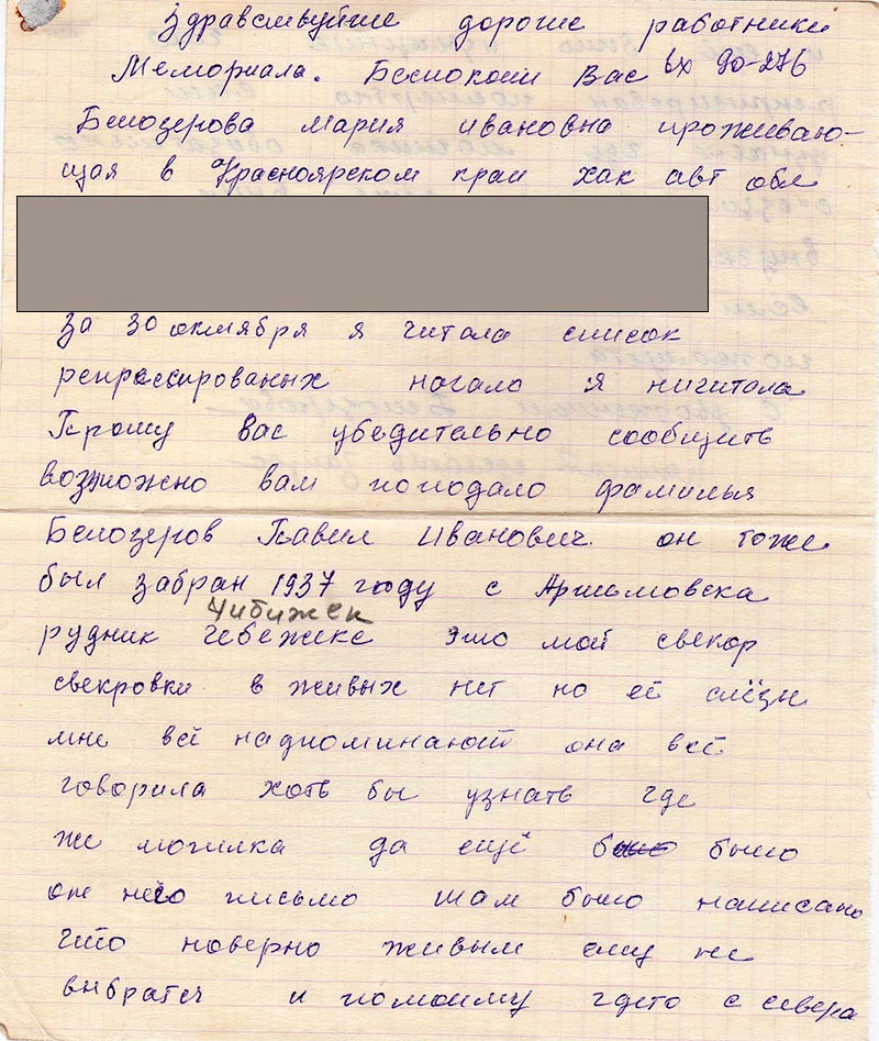 За 30 октября я читала список репрессированых начало я ничитала. Прошу Вас убедительно сообщить возможно вам поподало фамилья Белозеров Павил Иванович от тоже был забран 1937 году с Аршемовска рудник Чебежекс (Чибижек) это мой свекор свекровки в живых нет но её слёзы мне всё надпоминают она всё говорила хоть бы узнать где же могилка да ещё было от него письмо там было написано что наверно живым ему не выбраться и помоиму гдето с севера и ещё было изыщение что реприсирован посмертно если узнаем где могилка обизательно съездим у папи есть внук внучка и уже 3-ое правнуков.