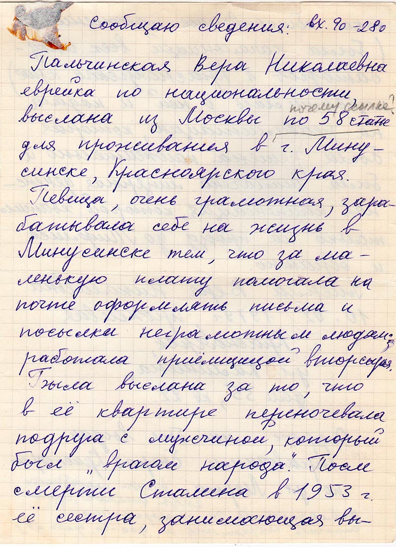 Пальчинская Вера Николаевна еврейка по национальности, выслана из Москвы по 58 статье для проживания в г. Минусинске, Красноярского края.