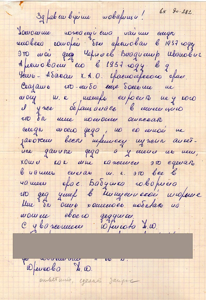 Я уже обращалась в милицию что бы мне помогли отыскать следы моего деда, но со мной не захотели вести переписку нужны анкетные данные деда а у меня их нет, хотя как мне кажется это сделать в наших силах т.к. это все в нашем крае. Бабушка говорила что дед умер в Минусинской тюрьме