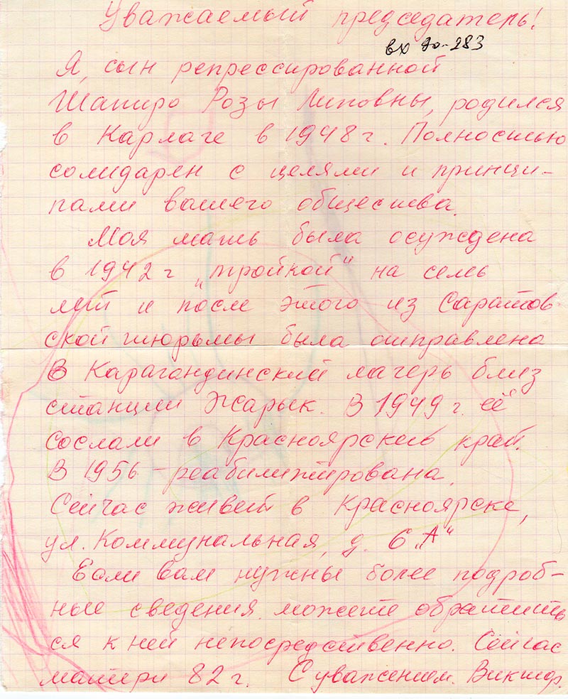 Я, сын репрессированной Шапиро Розы Липовны, родился в Карлаге в 1948 г. Полностью солидарен с целями и принципами вашего общества.