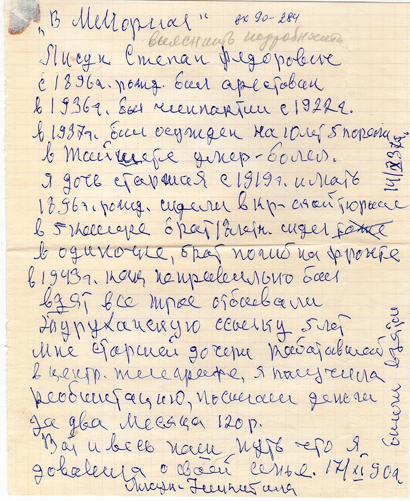 Лисун Степан Федорович с 1896 г. рожд. был арестован в 1936 г. был членпартии с 1922 г. в 1937 г. был осужден на 10 лет 5 ????? в Тайшете умер – болел.