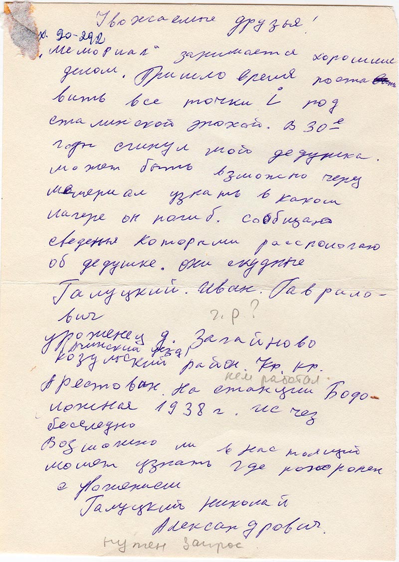 «Мемориал» занимается хорошим делом. Пришло время поставить все точки i под сталинской эпохой. В 30е годы сгинул мой дедушка. Может быть возможно через мемориал узнать в каком лагере он погиб. Сообщаю сведения которыми распологаю об дедушке. Они скудные.