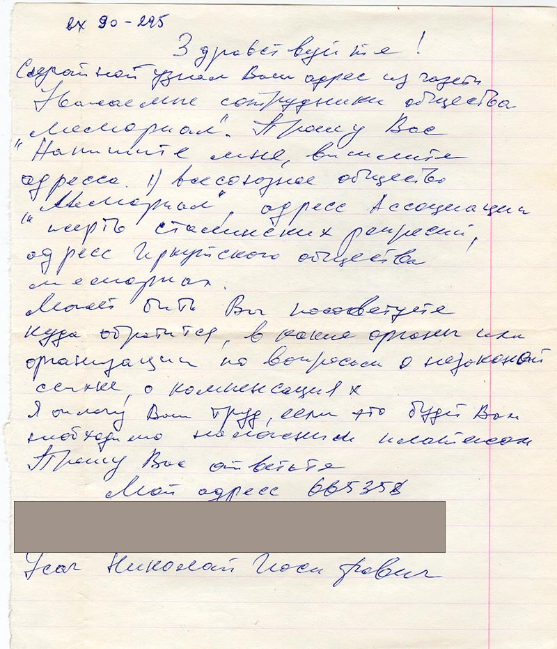 Случайно узнал Ваш адрес из газеты. Уважаемые сотрудники общества «Мемориал». Прошу Вас напишите мне, вышлите адреса 1) всесоюзное общество «Мемориал», адресс ассоциации жертв сталинских репрессий, адресс Иркутского общества Мемориал.