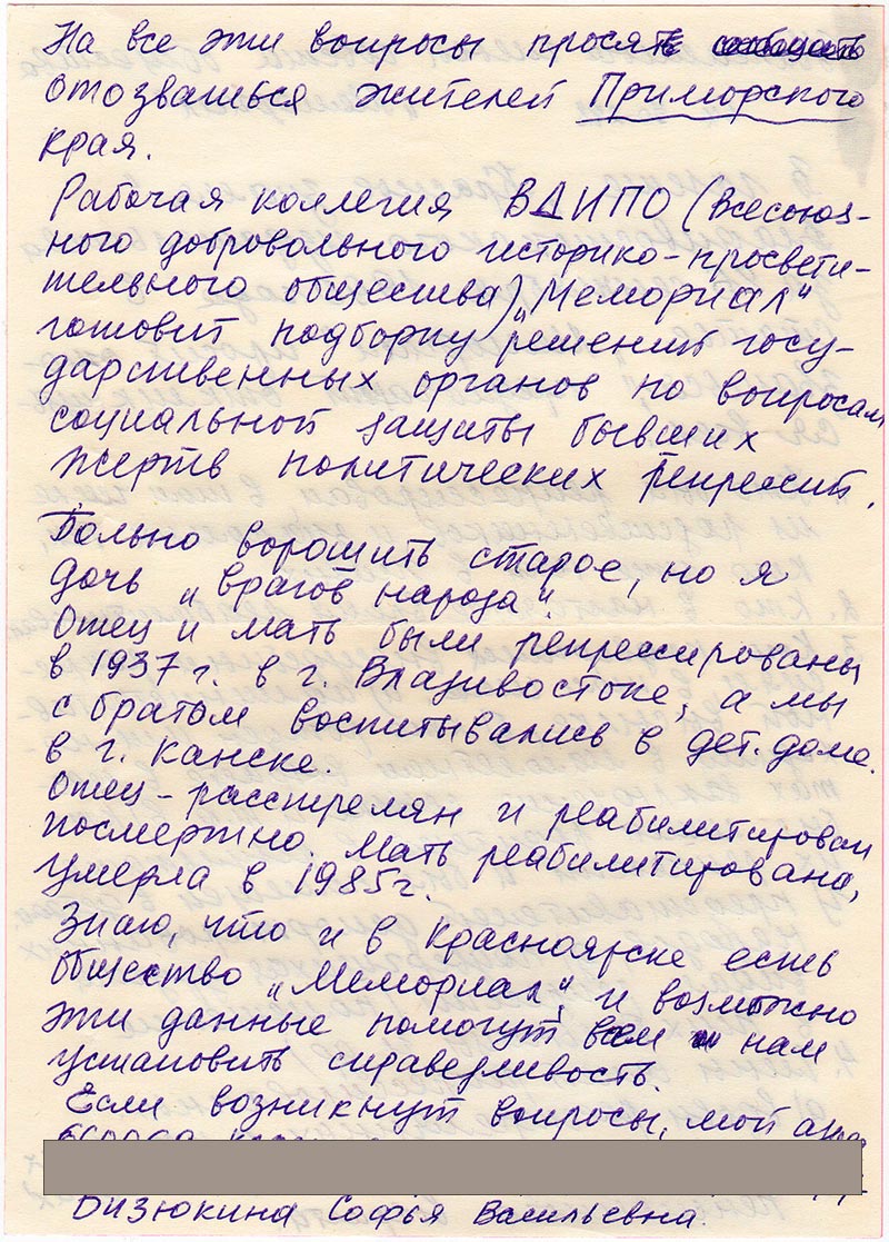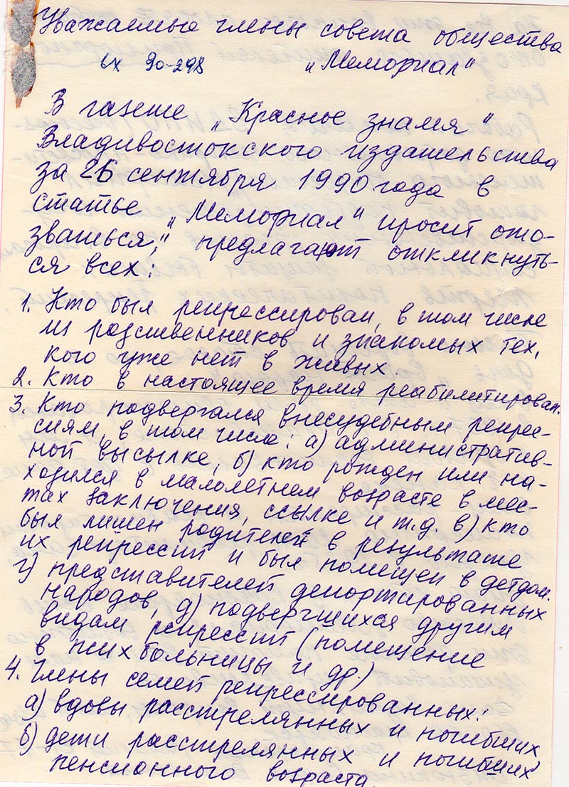 В газете «Красное знамя» Владивостокского издательства за 26 сентября 1990 года в статье «Мемориал» просит отозваться», предлагают откликнуться всех: