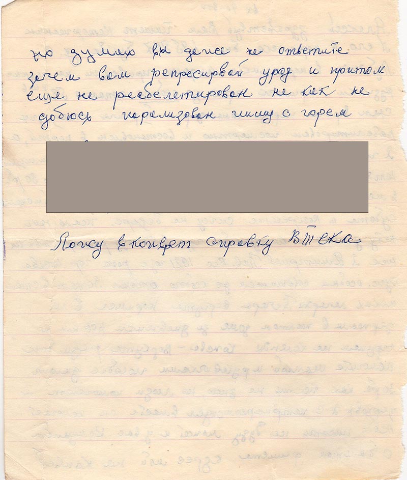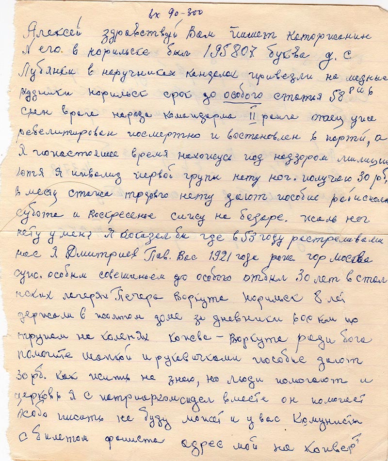Алексей здравствуй Вам пишет каторжанин № его в норильске был 195807 быквы д. С Лубянск в наручниках кандолах привезли на медные рудники норильск срок до особого статья 58 . 8 и 6 сын врага народа командирма II ранга отец уже ребелитирован посмертно и востановлен в порти, а я по настояшее время нахожусь под надзором милиций ????? я инвалид первой групы нету ног. Получаю 30 рб в месяц стажа трдового нету дают пособие райисполк субота и воскресенье сижу на базаре. Жаль ног нету у меня я показал бы где в 53 году растреливали нас Я Дмитриев Пав. Вас. 1921 года рож. Гор. Москва суж. особым совешиньем до особого отбыл 30 лет в столнских лагерях Печера Воркута Норильск 8 лет держали в жолтом доме за дневники 600 км по трупам на коленях Кожва – Воркута ради бога помогите шапкой и рукавичками пособие дают 30 рб. Как жить не знаю, но люди помогают и церковь я с патриархом сидел вместе он помогает особо писать не буду может и у вас комунисты с билетом фошиста адрес мой на конверт но думаю вы даже не ответите зачем вам репресирвой урод и притом еще не реебелетирован не как не добюсь порализован пишу с горем.