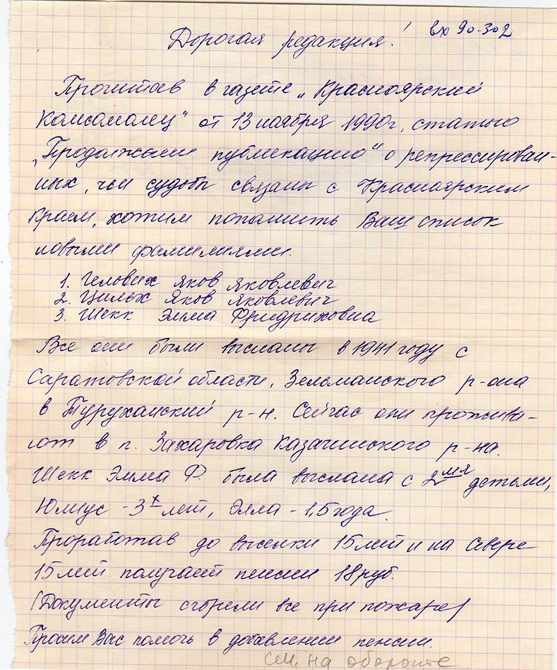 Прочитав в газете «Красноярский комсомолец» от 13 ноября 1990 г. статью «Продолжаем публикацию» о репрессированных, чьи судьбы связаны с Красноярским краем, хотим пополнить Ваш список новыми фамилиями.