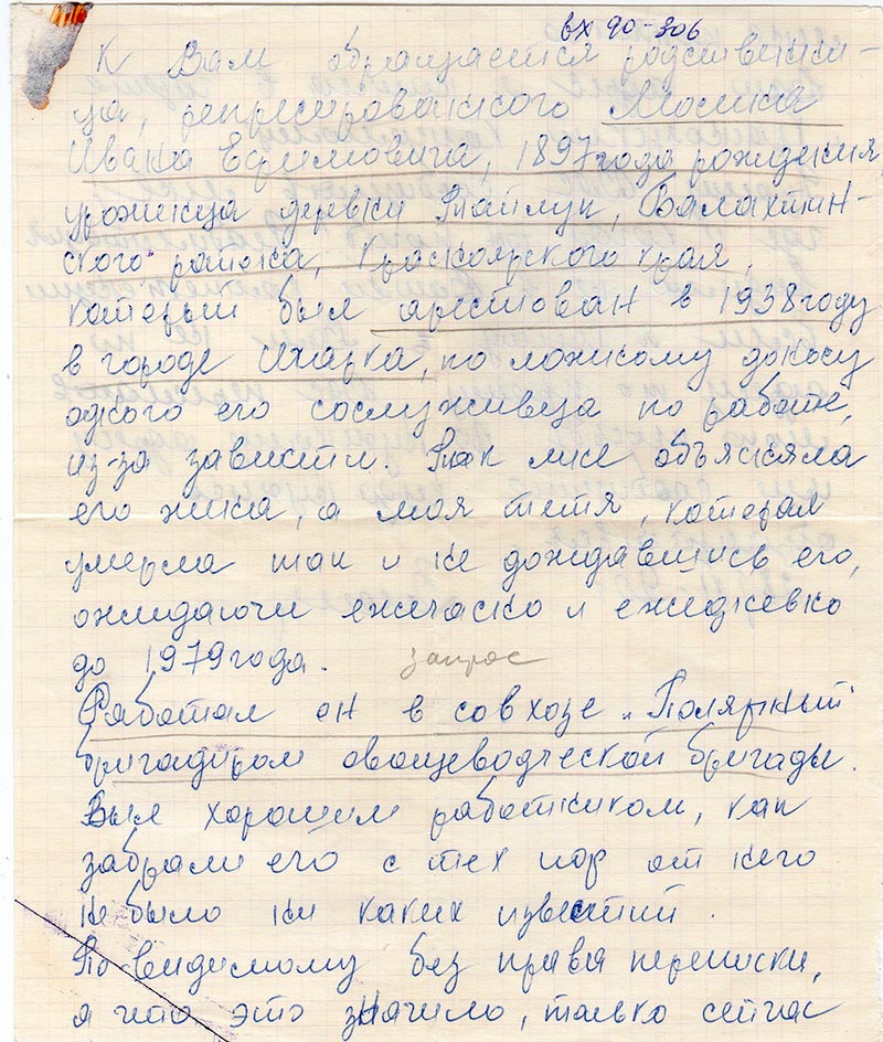К Вам обращается родственница, репрессированного Мосина Ивана Ефимовича, 1897 года рождения, уроженца деревни Тайлун, Балахтинского района, Красноярского края, который был арестован в 1938 году в горде Игарка по ложному доносу одного его сослуживца по работе, из-за зависти. Так мне объясняла его жена, а моя тетя, кооторая умерла так и не дождавшись его, ожидаюче ежечасно и ежедневно до 1979 года.
