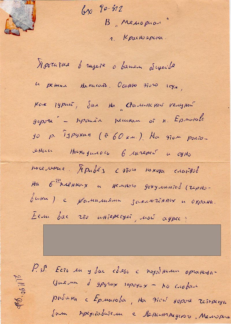 Письма в Красноярское общество "Мемориал"