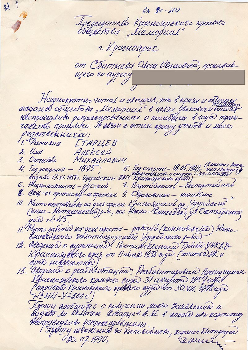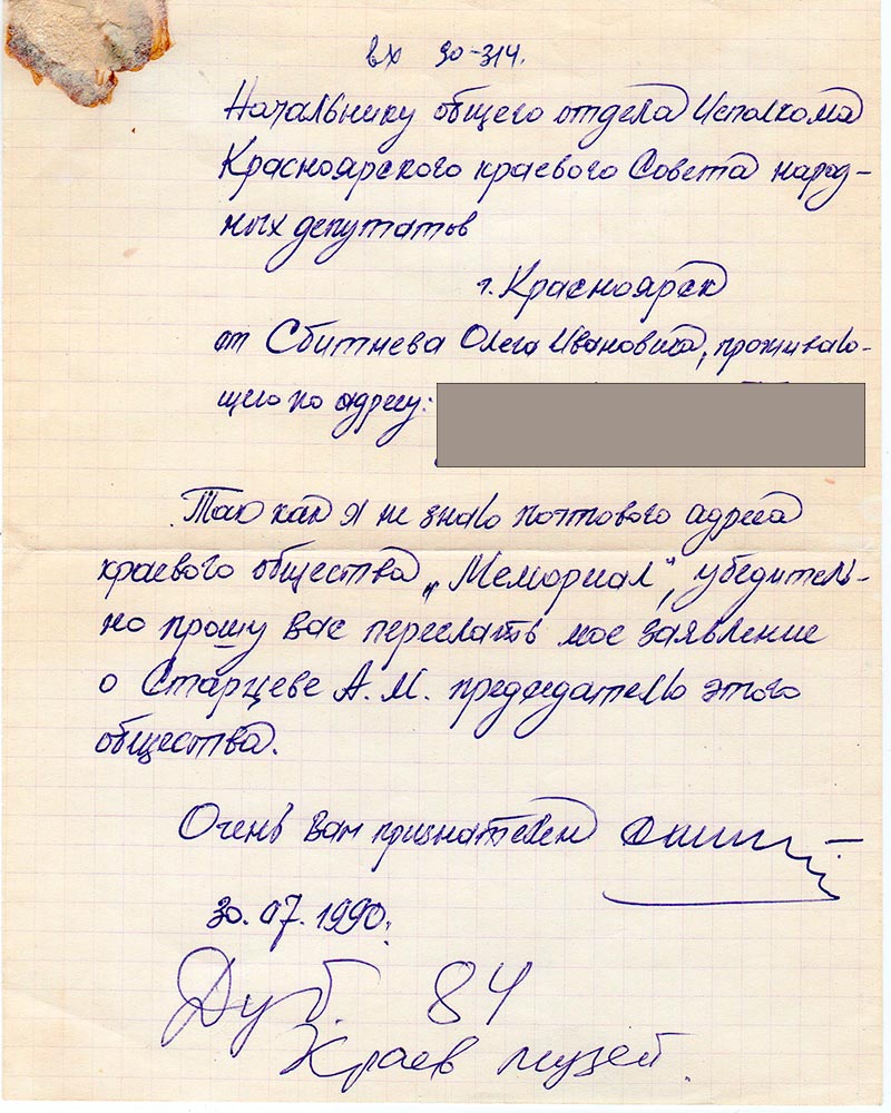 Так как я не знаю почтового адреса краевого общества «Мемориал», убедительно
