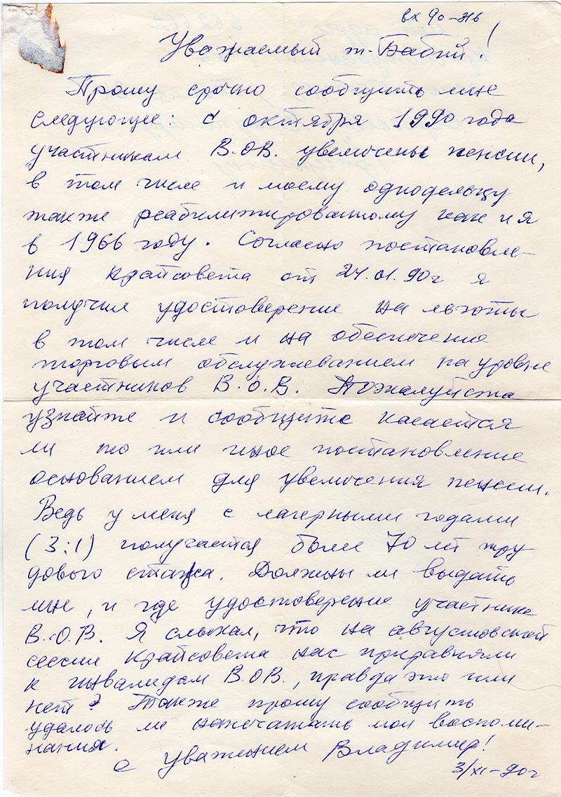 Прошу срочно сообщить мне следующее: с октября 1990 года участникам В.ОВ.