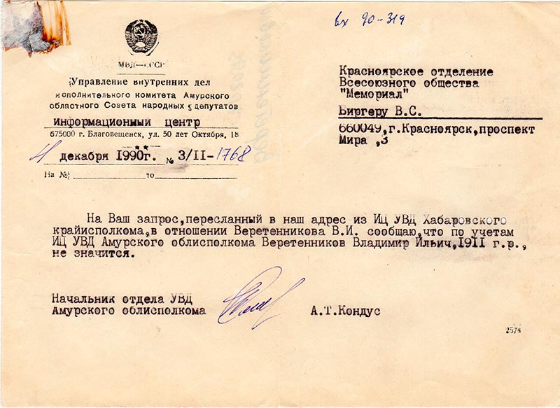 Письма в Красноярское общество "Мемориал"