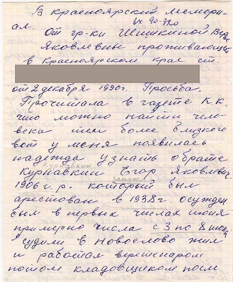 Прочитала в газете К.К. что можно найти человека тем более близкого вот у меня появилась надежда узнать о брате Курнавкин Егор Яковлевич 1906 г.р. который был арестован в 1938 г. Осужден был в первых числах июня примерно числа с 3 по 8 июня судили в Новоелово ВНовосёлово жил и работал веретенаром потом кладовщиком после чево и был арестован в Игрышенском молмясо совхозе семья была жена и двое детей жена умерла в 1945 г. работала в колхозе свинаркой, сын с 1936 г. умер остался один сын с 1931 г.р. очень хочется знать судьбу моего брата мы от него получили помнится несколько писем, адрес его Приморский край ст. Славянка п/я 288 (карандашом: сохранились ли) а остальное непомню мы ему писали а от него всего было письма два не больше и все от него больше ничево не было очень и очень просим если позволит возможность то хотя в списках но сообщите.
