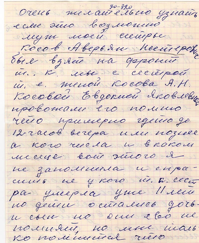 Очень желательно узнать если это возможно муж моей сестры Косов Аверьян Нестерович был взят на фронт т.к. мы с сестрой т.е. женой Косова А.Н. Косовой Евдокией Яковлевной провожали его помню что примерно гдето до 12 часов вечера или познее а кого числа и в каком месеце вот этого я не запомнила и спрасить не у кого т.к. сестра умерла уже 11 лет но дети остались дочь- и сын но они ево не помнят, но мне только помнится что это было в начале войны в июле или августе т.к. было тепло в 1941г получили письмо из Ачинска поехал на фронт письмо было на двух бумажках от консервных банок и еще прислал из Ачинска домашнюю одежду и несколько шт. кусочков сахара для детей и все больше ничево не было от него, только извещение пропал безвисти, вот и все так же очень хочется знать если это возможно, где он погиб.