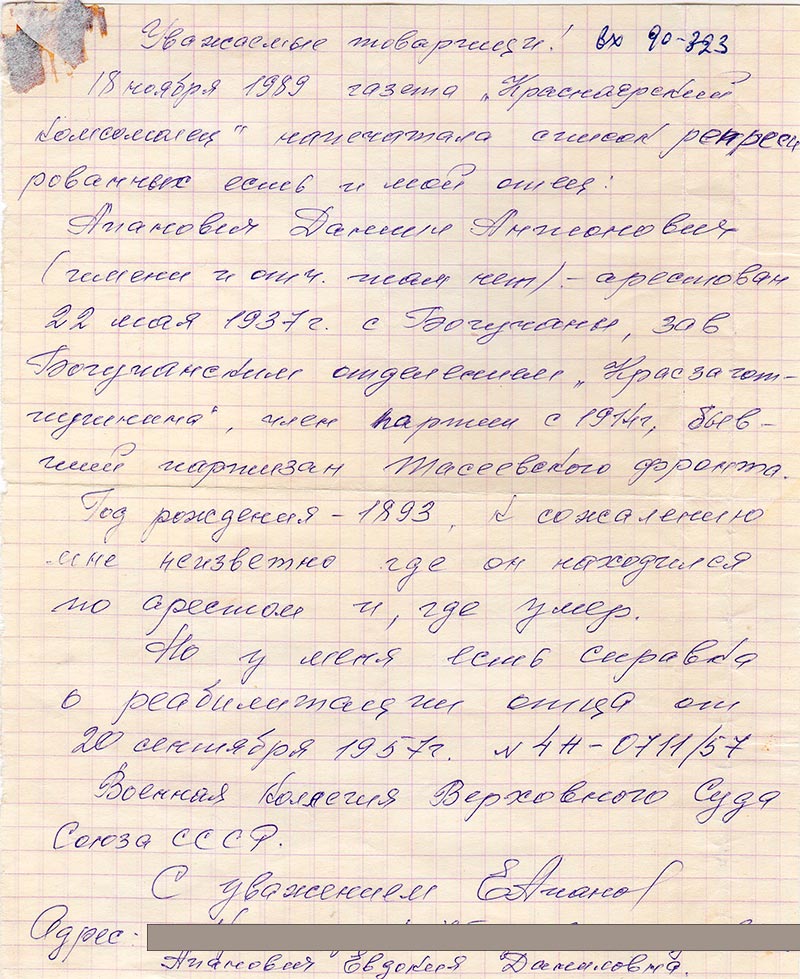 18 ноября 1989 газета «Красноярский комсомолец» напечатала список репресированных есть и мой отец: