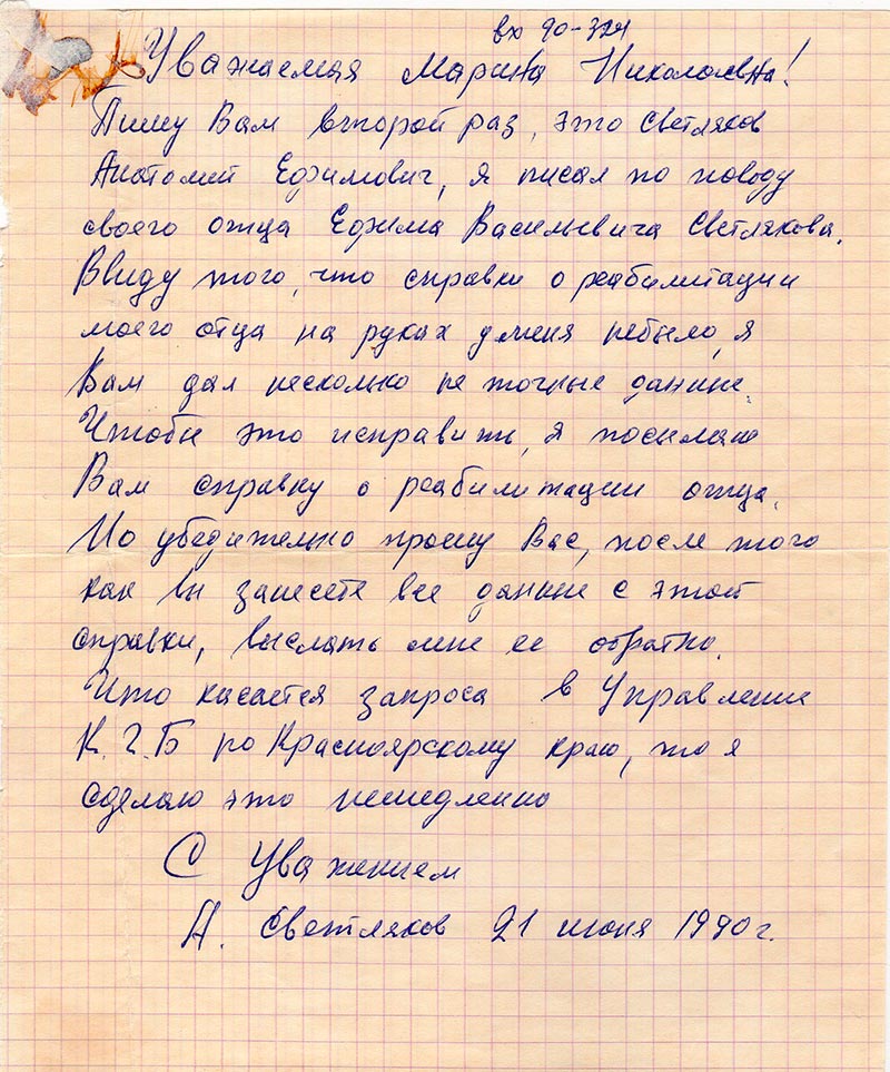 своего отца Ефима Васильевича Светлякова. Ввиду того, что справки о реабилитации