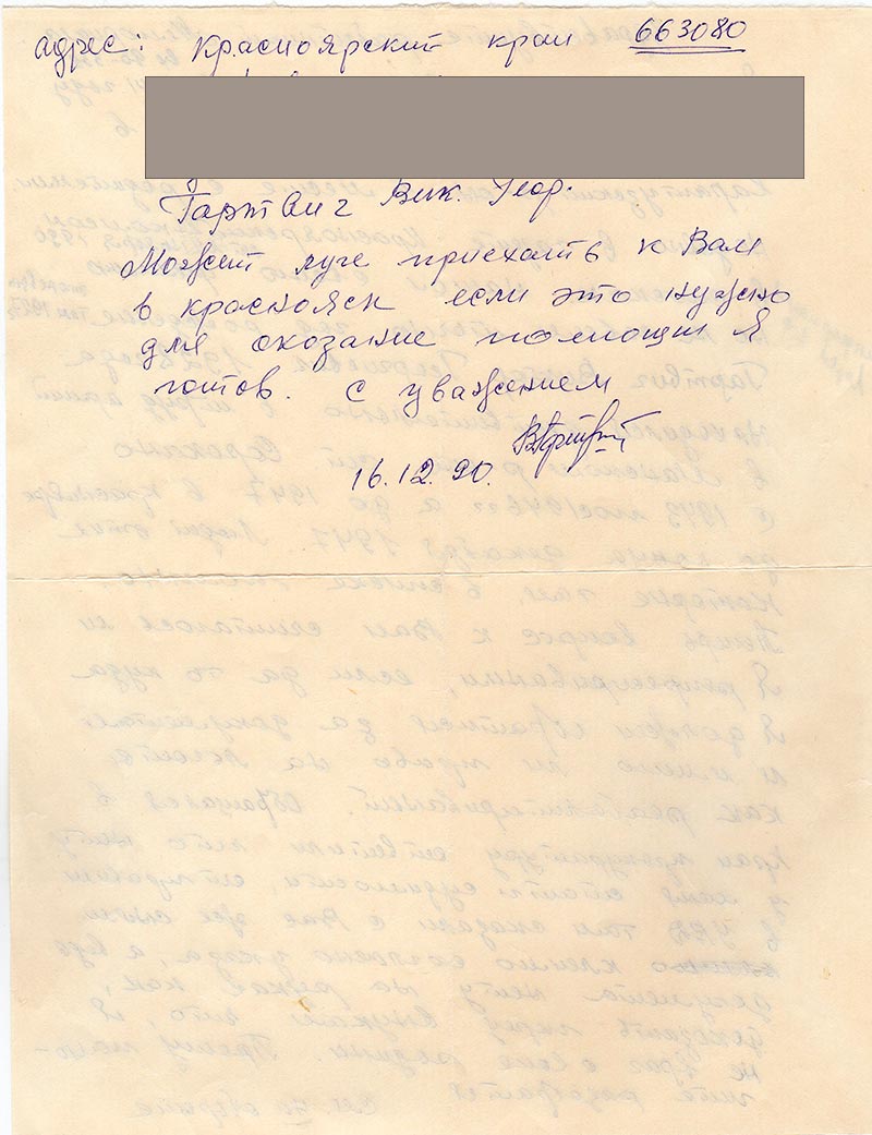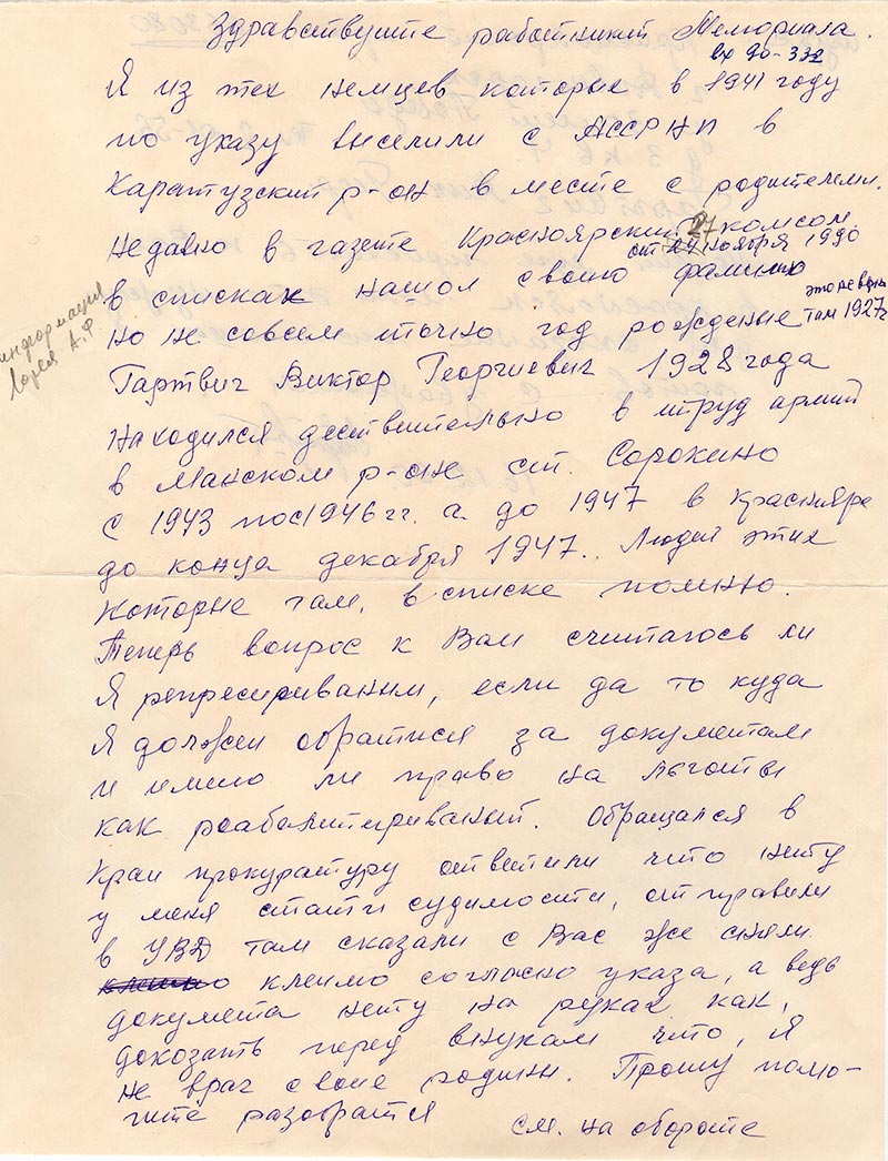 Я из тех немцев которые в 1941 году по указу выселили с АССРНП в Каратузский р-он в месте с родителями. Недавно в газете Красноярский комсом. от 24 ноября 1990 в списках нашол свою фамилию но не совсем точно год рождения там это февраль 1927 г. Гартвиг Виктор Георгиевич 1928 года находился действительно в труд армии в Манском р-оне ст. Сорокино с 1943 по 1946 гг. а до 1947 в Красноярск до конца декабря 1947. Людей этих которые там, в списке помню.
