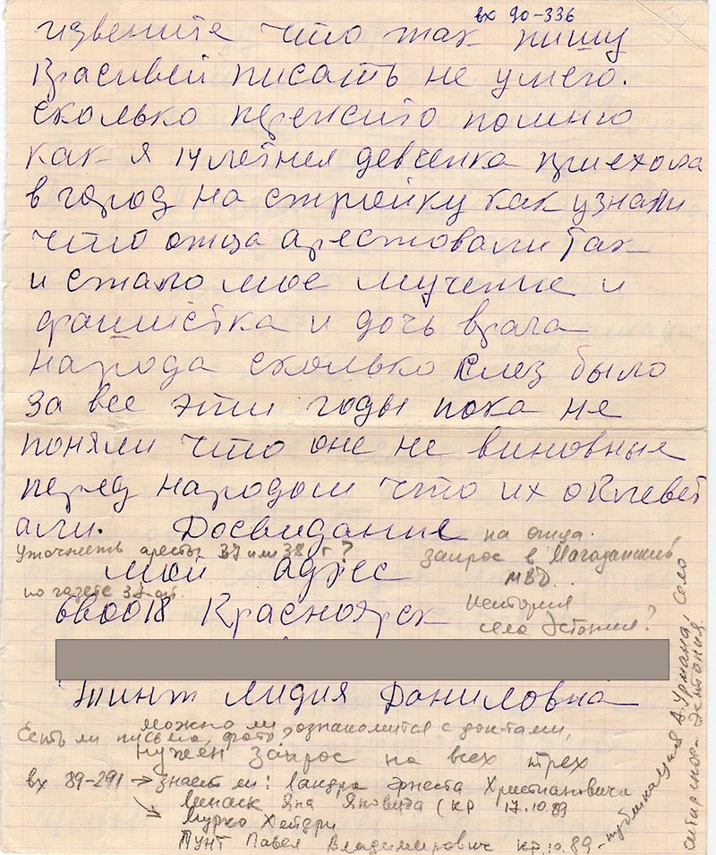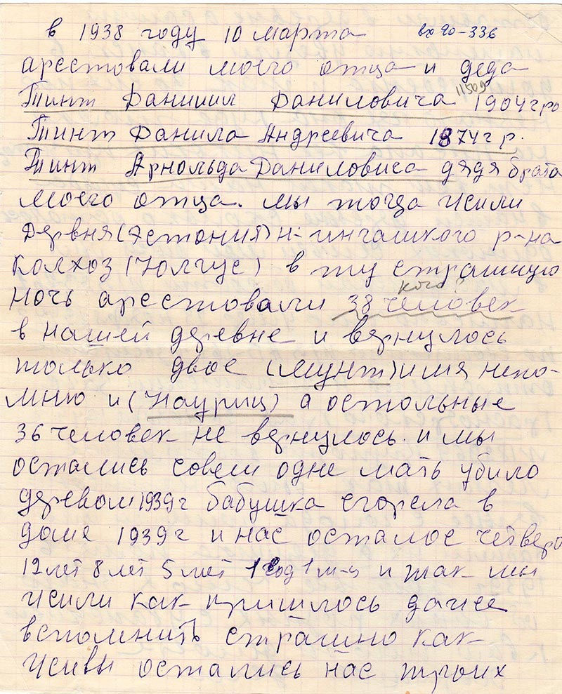 В 1938 году 10 марта арестовали моего отца и деда Тинт Даниил Даниловича 1904 г.р., Тинт Данила Андреевича 1874 г.р. Тинт Арнольда Даниловича дядя брата моего отца. Мы тогда жили дервня (Эстония) Н-Ингашского р-на колхоз (Юлгус) в ту страшную ночь арестовали 38 человек в нашей деревне и вернулось только двое (Мунт) имя непомню и (Науриц) а остальные 36 человек не вернулось. И мы остались совем одне мать убило деревом 1939 г. бабушка сгорела в доме 1939 г и нас осталось четверо 12 лет 8 лет 5 лет 1 год 1 м-ц и так мы жили как пришлось даже вспомнит страшно как живы остались нас троих оставили в деревне а самую маленькую увезли в Канск в дом ребенка и так до сих пор незнаю где она куда толко не писала все никоких призноков нет. Вот такая наша судьба в нашей деревьне сколько осталось одиноких семьей мой отец был в магаданский области п/я АВ-261 написано что умер 23 ноября 1944 г по сообщении. п/я АВ-261 извещение отправлено Н-Ингашский загс Красноярского края 26 ноября 1944 г № 182969 крупозно восполение лег-ких так было написано вернее с голода померли или забили их а дедушка помер в 1939 г вот все что я знаю об своих родных с уважением к вам что вы делоете хорошое дело