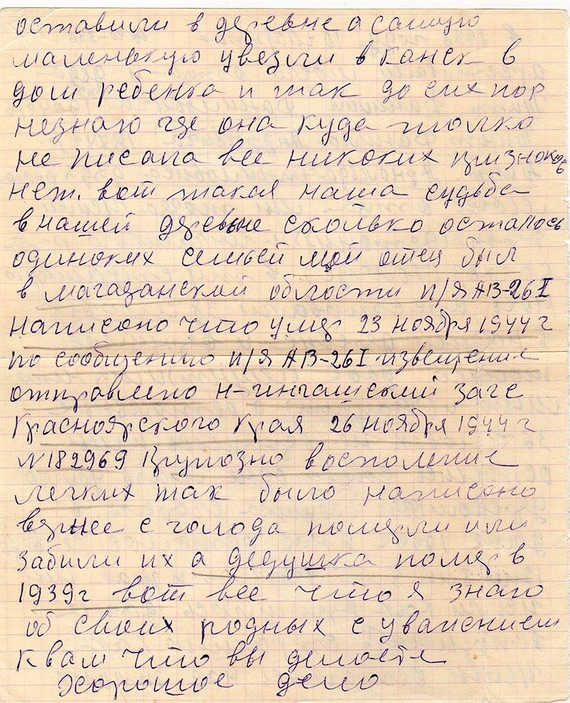 Извените что так пишу красивей писать не умею. Сколько пережито помню как я 14летнея деченка приехола в город на стройку как узнали что отца арестовали так и стало мое мучение и фашистка и дочь врага народа сколько слез было за все эти годы пока не поняли что оне не виновные пе-ред нардом что их оклеветали. Досвидание