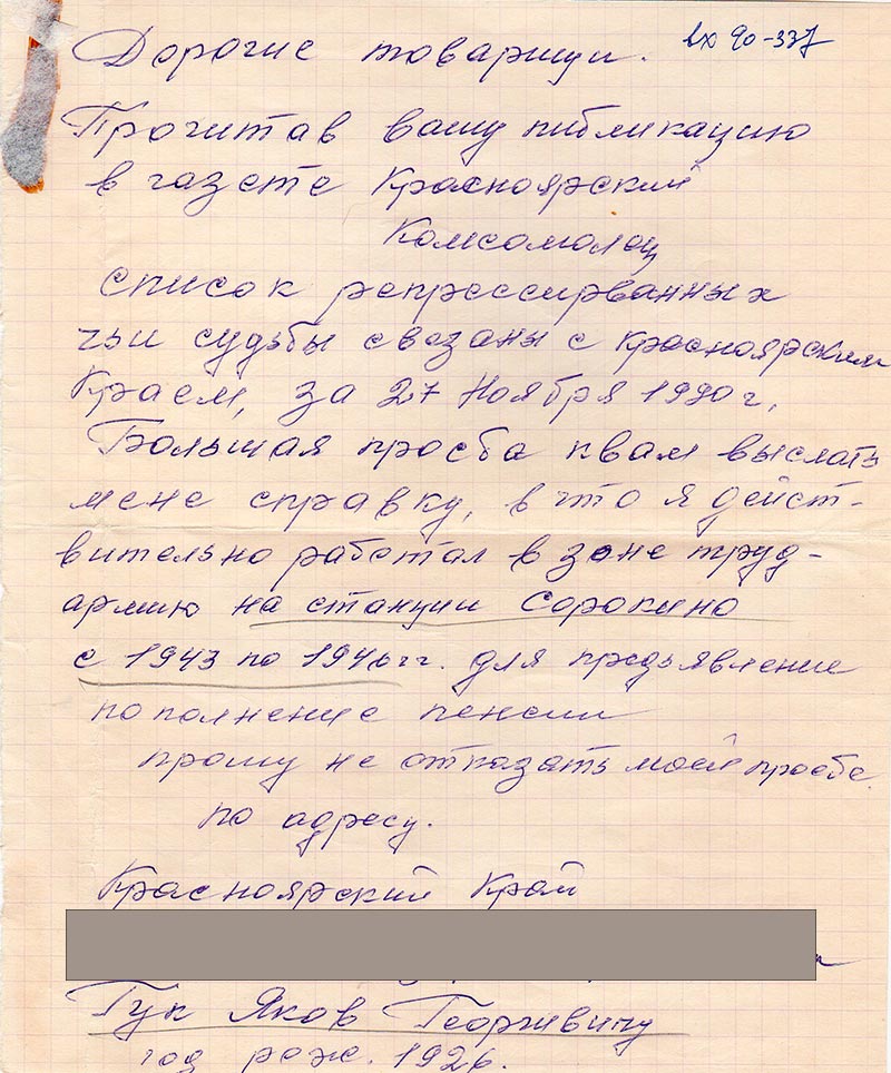Прочитав вашу публикацию в газете Красноярский Комсомолец список репрессирваных чьи судьбы связаны с Красноярским краем за 27 ноября 1990 г.
