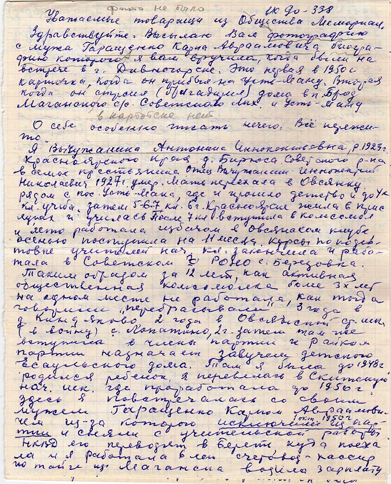 Я Выжчужанина Антонина Иннокентьевна, р. 1923 г. Красноярского края д. Бирюса Советского р-на в семье крестьянина. Отец Вычужанин Иннокентий Николаевич 1927 г. умер. Мать переехала в Овсянку. Рядом с пос. Усть-Мана, где и прошло детсво и до 4х кл. учеба, затем 5-6-7 кл. в г. Красноярске жила в прислугах и училась. После 7 кл вступила в комсомол и лето работала избачом в овсянском клубе, осенью поступила на 11 месяч. курсы по подготовке учителей нач. кл. закончила и работала в Советском РОНО с. Березовка.