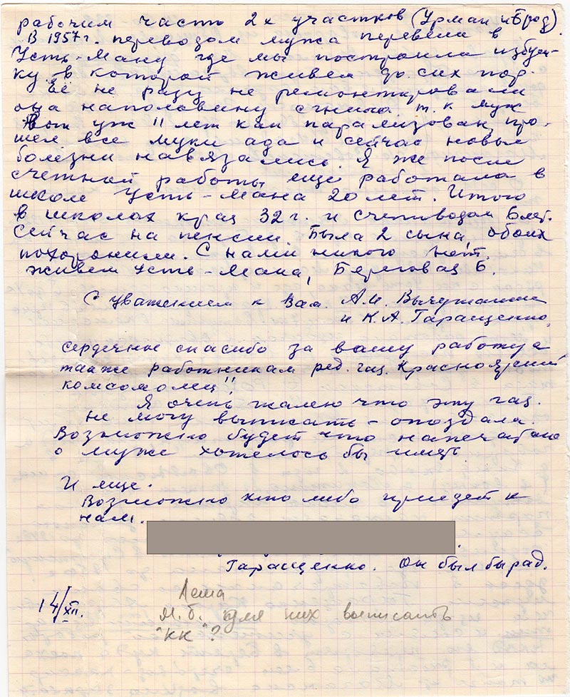 Таким образом за 12 лет, как активная общественная комсомолка более 3х лет на одном месте не работала, как тогда говорили «перебрасывали» 3 года в д. Киндяново, 2 года в Овсянской ср. шк. (в войну) с. Лопатино, 2 г. затем там же вступила в члены партии и райком партии назначает завучем детского Есаульского дома. Там я была до 1948 г., родился ребенок. Я перевелась в Скитскую нач. шк. где проработала да 1950 г. здесь я повстречалась со своим мужем Гаращенко Карпом Авраамовичем из-за которого исключили 1 окт. 1950 г. из партии и сняли с учительской работы. НКВД его переводят в Береть, куда поехала и я работала 6 лет счетовод-кассир по тайге из Маганска возила зарплату рабочим часть 2х участков (Урман и Брод).