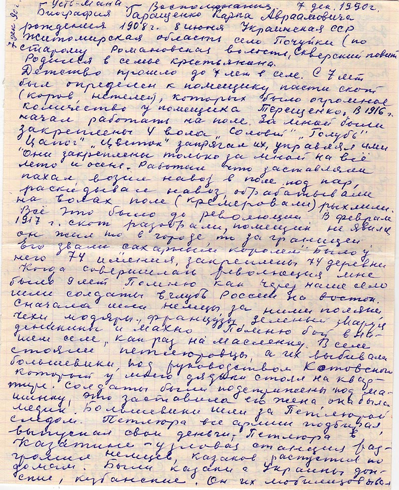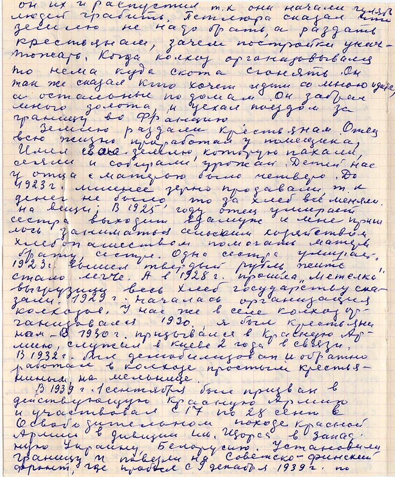 Землю раздали крестьянам. Отец всю жизнь проработал у помещика, имея свою землю, которую пахали, сеяли и собирали урожай. Детей нас у отца с матерью было четверо. До 1923 г. лишнее зерно продавали, т.к. денег не было, то за хлеб все меняли на вещи. В 21925 году отец умирает сестра выходит взамуж и мне пришлось заниматься сельским хозяйством хлебопашеством помогать матери, брату, сестре. Одна сестра умирает. 1923 г. вышел твердый рубль, жить стало легче. А в 1928 г. прошла «метелка» выгрузили весь хлеб государству сказали. 1929 г. началась организация колхозов. У нас же в селе колхоз организовался 1930, я был крестьянином – в 1930 г. призывался в Красную Армию, служил в Киеве 2 года в связи. В 1932 г. Был демобилизован и обратно работал в колхозе простым крестьянином на мельнице.