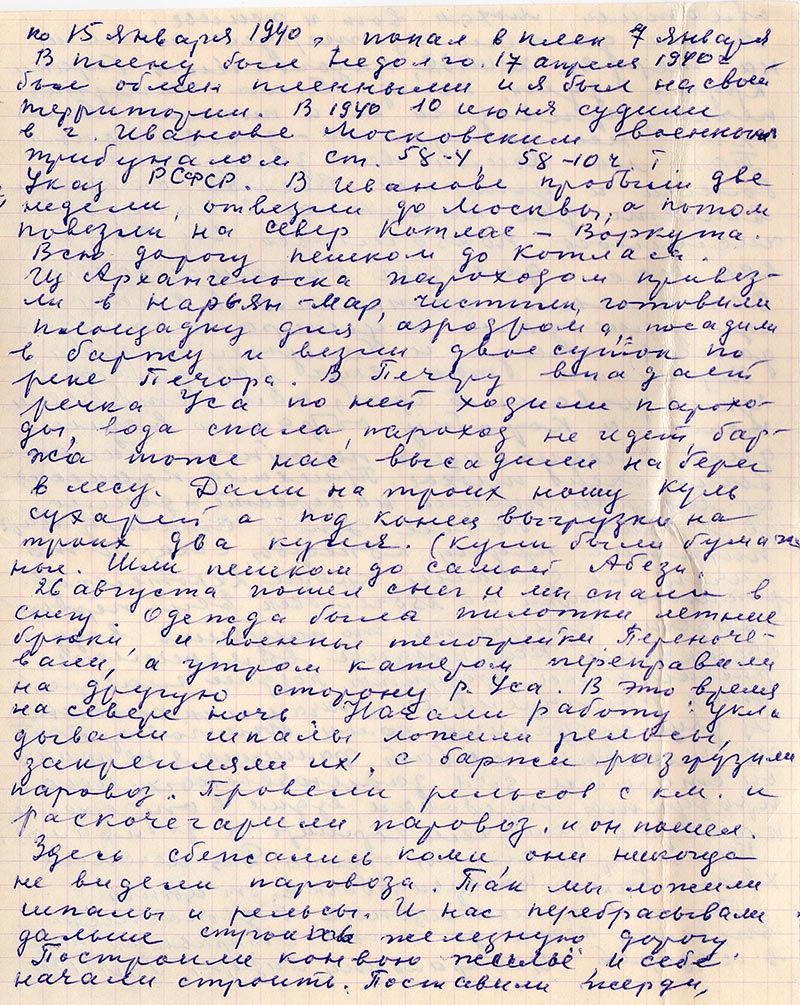 В 1939 г. 1 сентября был призван в действующую Красную армию и участвовал с 17 по 28 сент в освободительном походе Красной Армии в дивизии им. Щорса в западную Украину, Белоруссию. Установили границу и повезли на Советско-финский фронт, где пробыл с 9 декабря 1939 г. по 15 января 1940 г., попал в плен 7 января. В плену был недолго. 17 апреля 1940 г. был обмен пленными и я был на своей территории. В 1940 10 июня судили в г. Иванове Московским военным трибуналом ст. 58-4, 58-10 ч.т. Указ РСФСР. В Иванове пробыли две недели, отвезли до Москвы, а потом повезли на север Котлас-Воркута. Всю дорогу пешком до Котласа. Из Архангельска пароходом привезли в Нарьян-Мар, чистили, готовили площадку для аэродрома, посадили в баржу и везли двое суток по реке Печора. В Печору впадает речка Уса по ней ходили пароходы, вода спала, пароход не идет, баржа тоже нас высадили на берег в лесу. Дали на троих ношу куль сухарей а под конец выгрузки на троих два куля (кули были бумажные. Шли пешком до самой Абези. 26 августа пошел снег и мы спали в снегу. Одежда была пилотки, летние брюки, и военные телогрейки. Переночевали, а утром катером переправили на другую сторону р. Уса. В это время на севере ночь. Начали работу: укладывали шпалы, ложили рельсы, закрепляли их, с баржи разгрузили паровоз. Провели рельсов с км и раскочегарили паровоз. И он пошел.