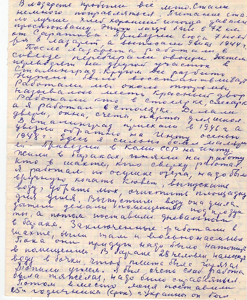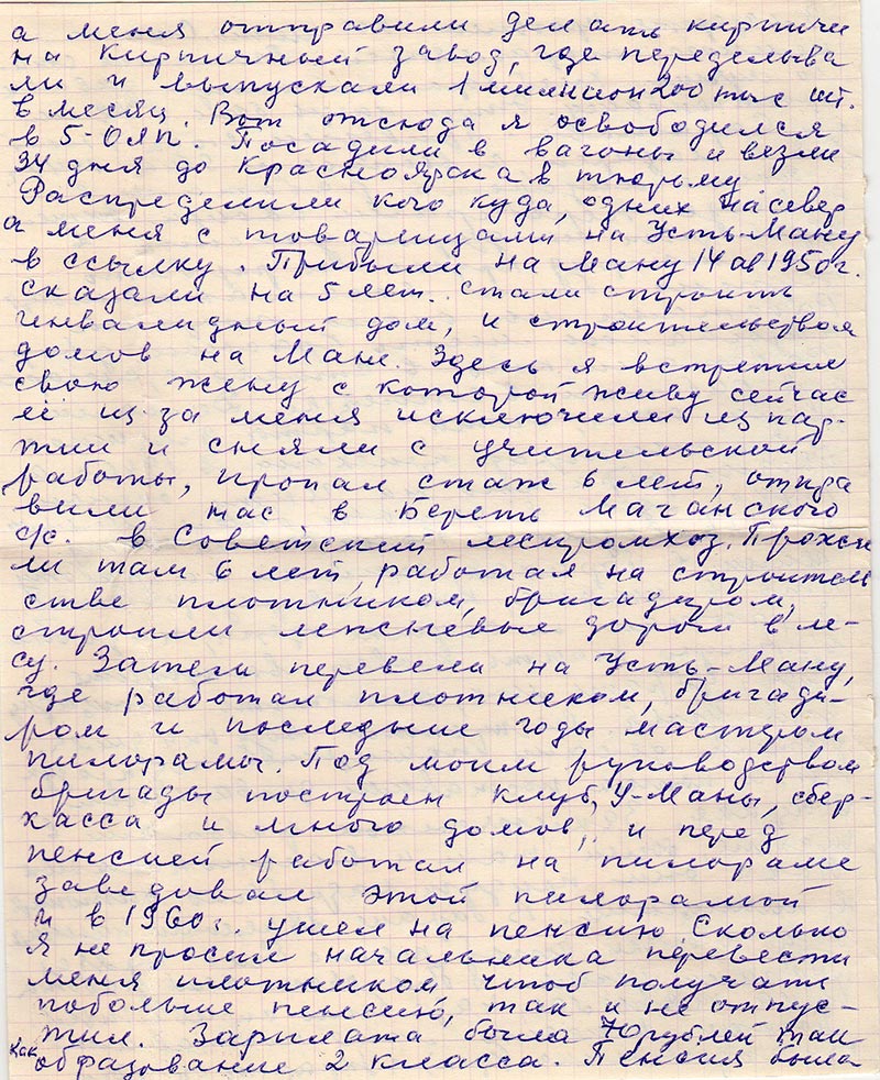 Распределили кто куда, одних на север, а меня с товарищами на Усть-Ману в ссылку. Прибыли на Ману 14 авг. 1950 г. сказали на 5 лет. Стали строить инвалидный дом, и строительством домов на Мане. Здесь я встретил свою жену с которой живу сейчас её из-за меня исключили из партии и сняли с учительской работы, пропал стаж 6 лет, отправили нас в Береть Маганского с/с. В Советский леспромхоз. Прожили там 6 лет, работал на строительстве плотником, бригадиром, строили лежневые дороги в лесу. Затем перевели на Усть-Ману, где работал плотником, бригадиром и последние годы мастером пилорамы. Под моим руководством бригады построен клуб У-Маны, сберкасса и много домов, и перед пенсией работал на пилораме заведовал этой пилорамой и в 1960 г. ушел на пенсию. Сколько я не просил начальника перевести меня плотником, чтоб получать побольше пенсию, так и не отпустил. Зарплата была 70 рублей так как образование 2 класса. Пенсия была все годы 82 рубля. Это благодаря еще премиальных и разных доплат.