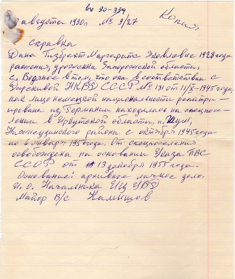Дана Гизбрехт Маргарите Яковлевне 1928 года ражения, уроженка Запорожской