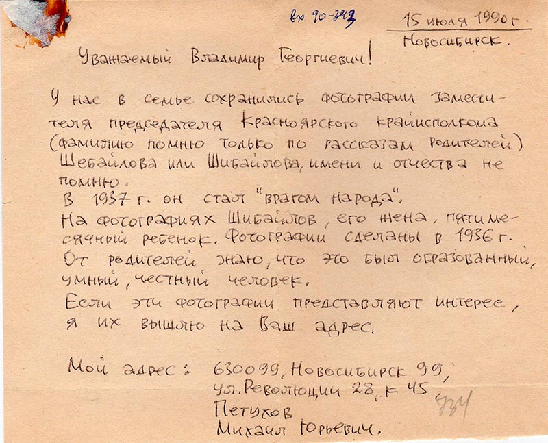 У нас в семье сохранились фотографии заместителя председателя Красноярского крайисполкома (фамилию помню только по рассказам родителей) Шебайлова или Шибайлова, имени и отчества не помню.