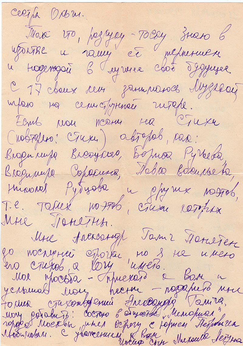 Поя просьба – приехать к Вам и услышав мои песни – подарить мне томик стихотворений Александра Галича. Могу добавить: состою в обществе «Мемориал» города Москвы, имел встречу с Юрием Петровичем Любимовым. С уважением к Вам,