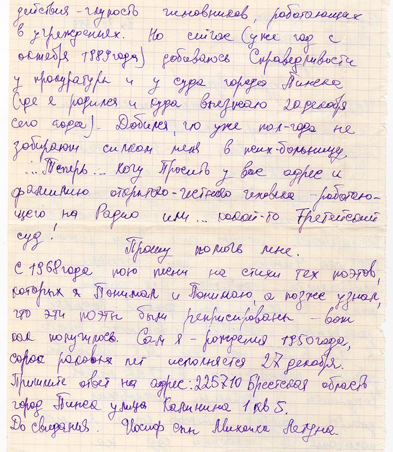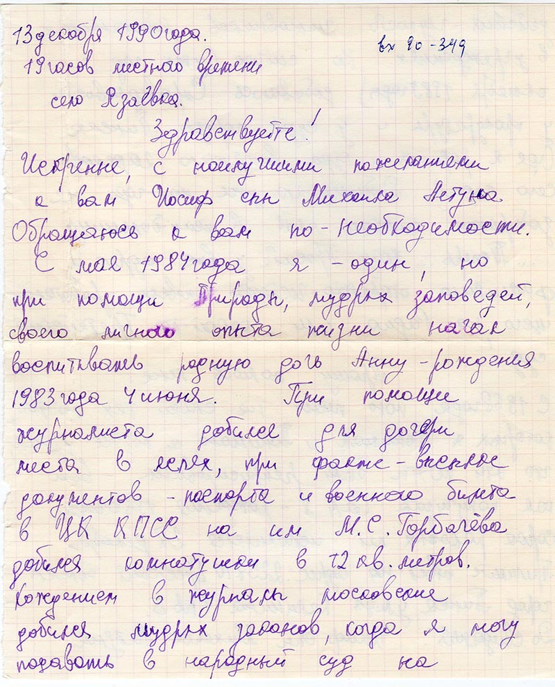 С мая 1984 годя я – один, но при помощи Природы, мудрых заповедей, своего личного опыта жизни начал воспитывать родную дочь Анну – рождения 1983 года 4 июня. При помощи журналиста добился для дочери места в яслях, при факте – высылке документов – паспорта и военного билета в ЦК КПСС на им. М.С. Горбачёва добился комнатушки в 12 кв. метров. Хождением в журналы московские добился мудрых законов, когда я могу подавать в народный суд на действия-глупость чиновников, работающих в учреждениях. Но сейчас (уже год с октября 1989 года) добиваюсь Справедливости у прокуратуры и у суда города Пинска (где я родился и куда выезжаю 20 декабря сего года). Добился, что уже пол-года не забирают силком меня в псих-больницу.