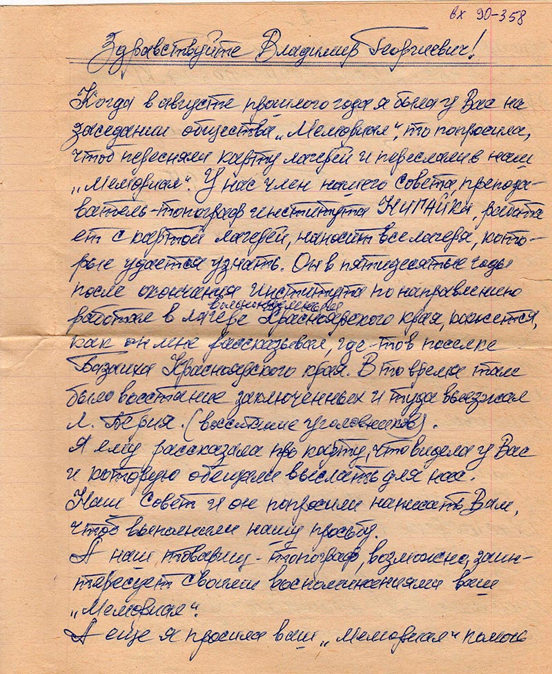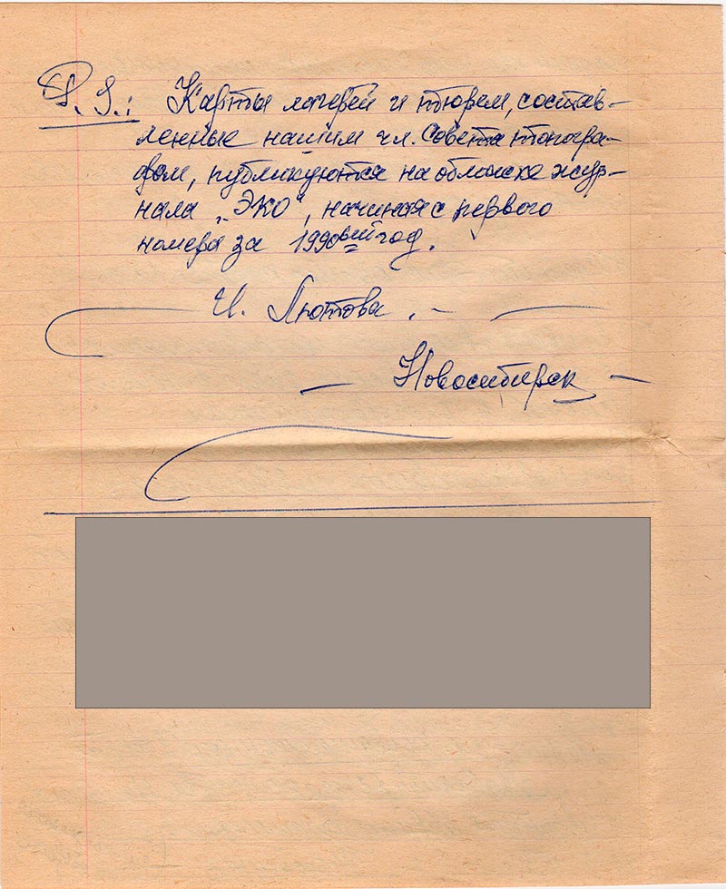 Когда в августе прошлого года я была у Вас на заседании общества “Мемориал”, то попросила, чтоб пересняли карту лагерей и переслали в наш “Мемориал”. У нас член нашего Совета, преподаватель-топограф института НИГАЙКа, работает с картой лагерей, наносит все лагеря, которые удается узнать. Он в пятидесятые годы после окончания института по направлению работал вольнонаемным в лагере Красноярского края, кажется, как он мне рассказывал, где-то в поселке Базаиха Красноярского края. В то время там было восстание заключенных и туда выезжал Л. Берия. (восстание уголовников).