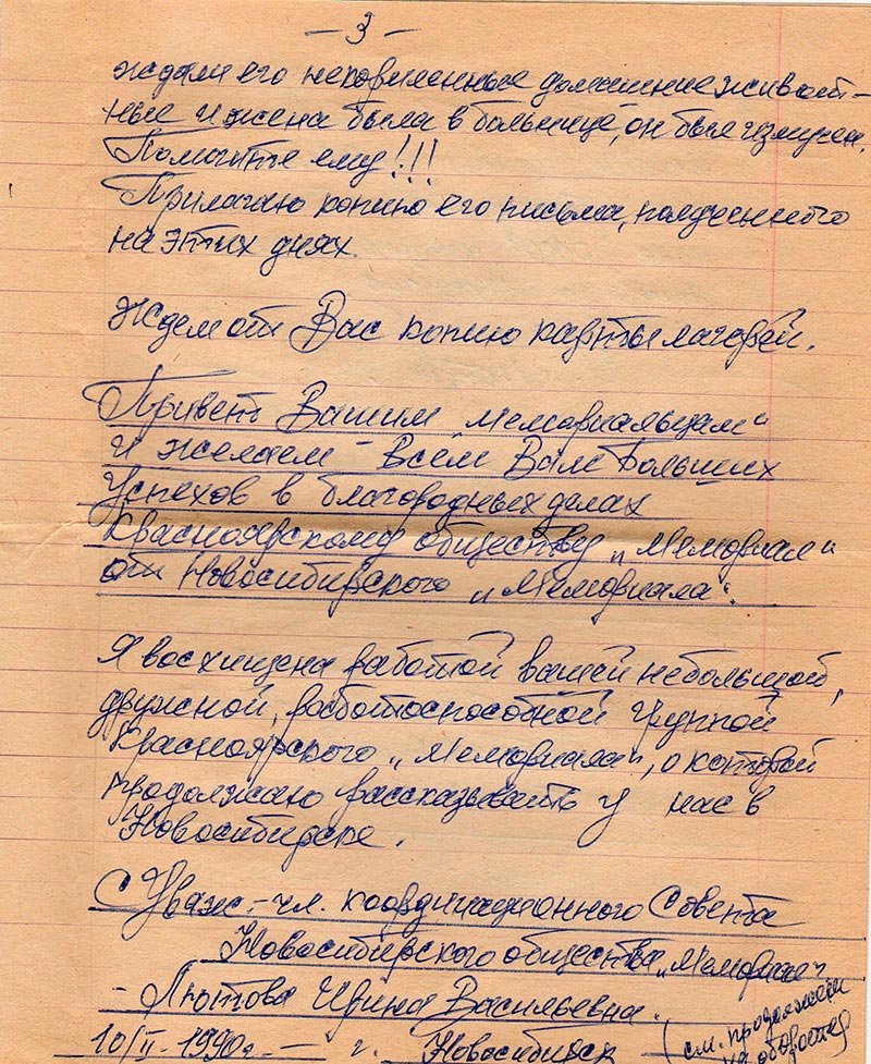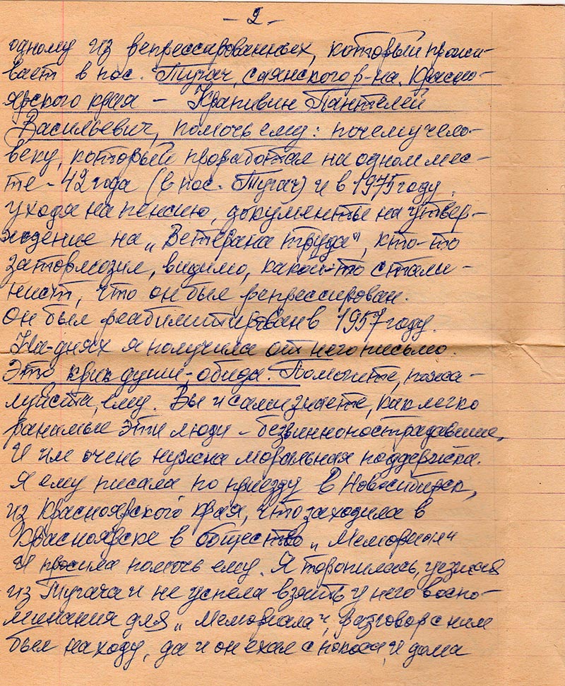 На днях я получила от него письмо. Это крик души - обида. Помогите, пожалуйста, ему. Вы и сами знаете, как легко ранимые эти люди - без-виннопострадавшие. И им очень нужна моральная поддержка. Я ему писала по приезду в Новосибирск, из Красноярского края, что заходила в Красноярске в общество “Мемориал” и просила помочь ему. Я торопилась, уезжая из Тугача и не успела взять у него воспоминания для “Мемориала”, разговор с ним был на ходу, да и он ехал с покоса, и дома ждали его некормленные домашние животные и жена была в больнице, он был измучен. Помогите ему!!!