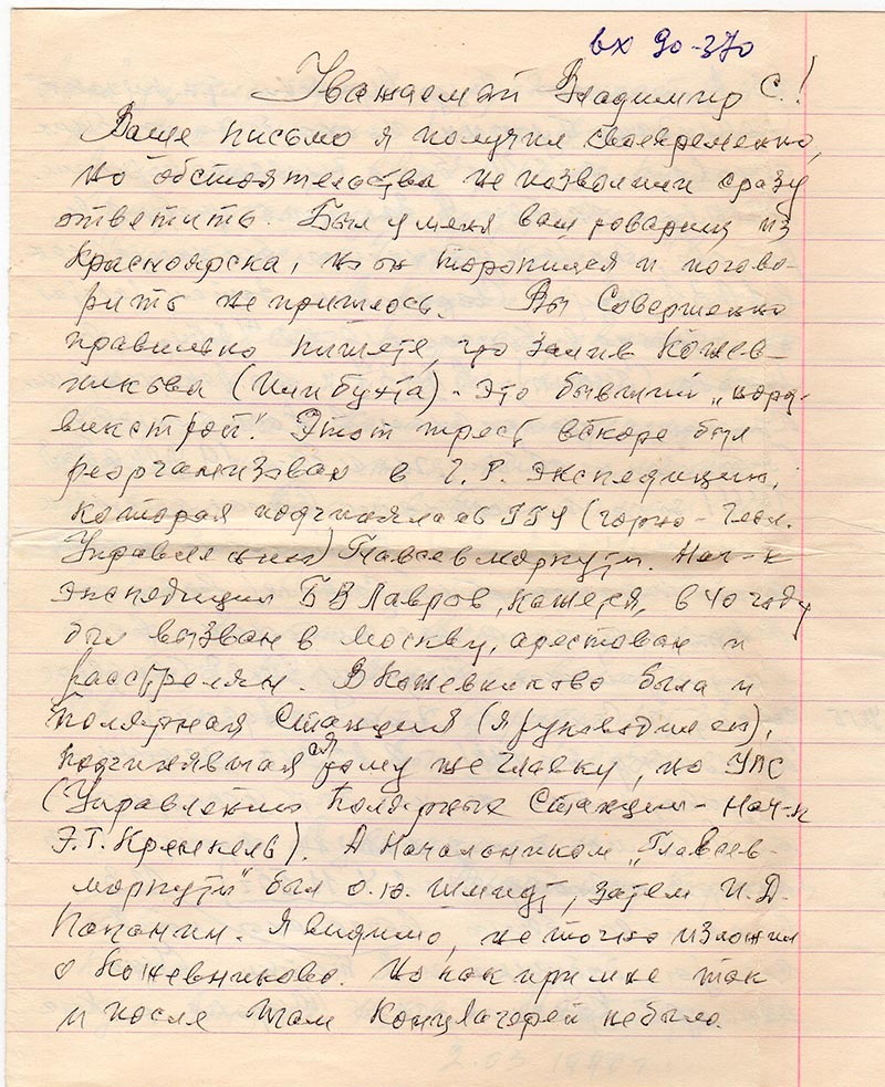 Ваше письмо я получил своевременно, но обстоятельства не позволили сразу ответить. Был у меня ваш товарищ из Красноярска, но он торопился и поговорить не пришлось. Вы Совершенно правильно пишете, что Залив Кожевникова (Или бухта) - Это бывший «нордвикстрой». Этот трест вскоре был реорганизован в Г. Р. экспедицию, которая подчинялась ГГУ (Горно-Геол. Управлению) Главсевморпути. Нач-к экспедиции Б В Лавров, кажется, в 40 году был вызван в Москву, арестован и расстрелян. В Кожевниково была и Полярная Станция (я руководитель), подчинявшаяся тому же Главку, но УПС (Управлению Полярных Станций - нач-к Э. Т. Кренкель). А Начальником «Главсевморпути» был О. Ю. Шмидт, затем И. Д. Папанин. Я видимо, не точно изложил о Кожевниково. Но как при мне так и после там Концлагерей не было. Из Архангельска туда привезли т.н. «Кулаков» (комендант Бусыгин), но они были на «общих основаниях». Их было 7 человек, все рабочие.
