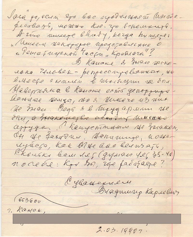 В Канске я знаю несколько человек-репрессированных, но вместе с ними в изоляции не был. Наверняка в Канске есть депортированные немцы, но я никого из них не знаю. Ведь я в трудармии не был, а знакомства исходят именно оттуда. С Капустиным не знаком, он не заходил. Напишите, пожалуйста, как мне вас величать, сколько вам лет (думаю лет 35-40)