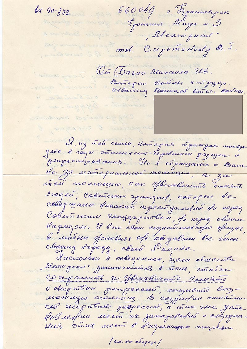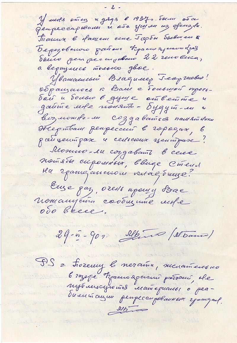 Я, из той семьи, которая трижды пострадала в годы сталинско-беревского разгула и репрессирования. Но я обращаюсь к Вам не за материальной помощью, а за той помощью, как увековечить память людей, Советских граждан, которые не совершали никаких преступлений ни перед Советским Государством, ни перед своим Народом. И всю свою сознательную жизнь, в любых условиях они отдавали все силы своему народу, своей Родине.
